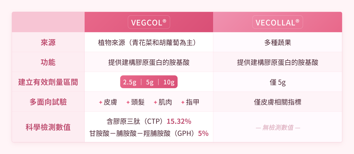 VEGCOL® 和 VECOLLAL® 都是萃取植物來源的胺基酸,仿人體第一型膠原蛋白的構造,兩者主要的差異關鍵,在於臨床研究結果與科學檢測。