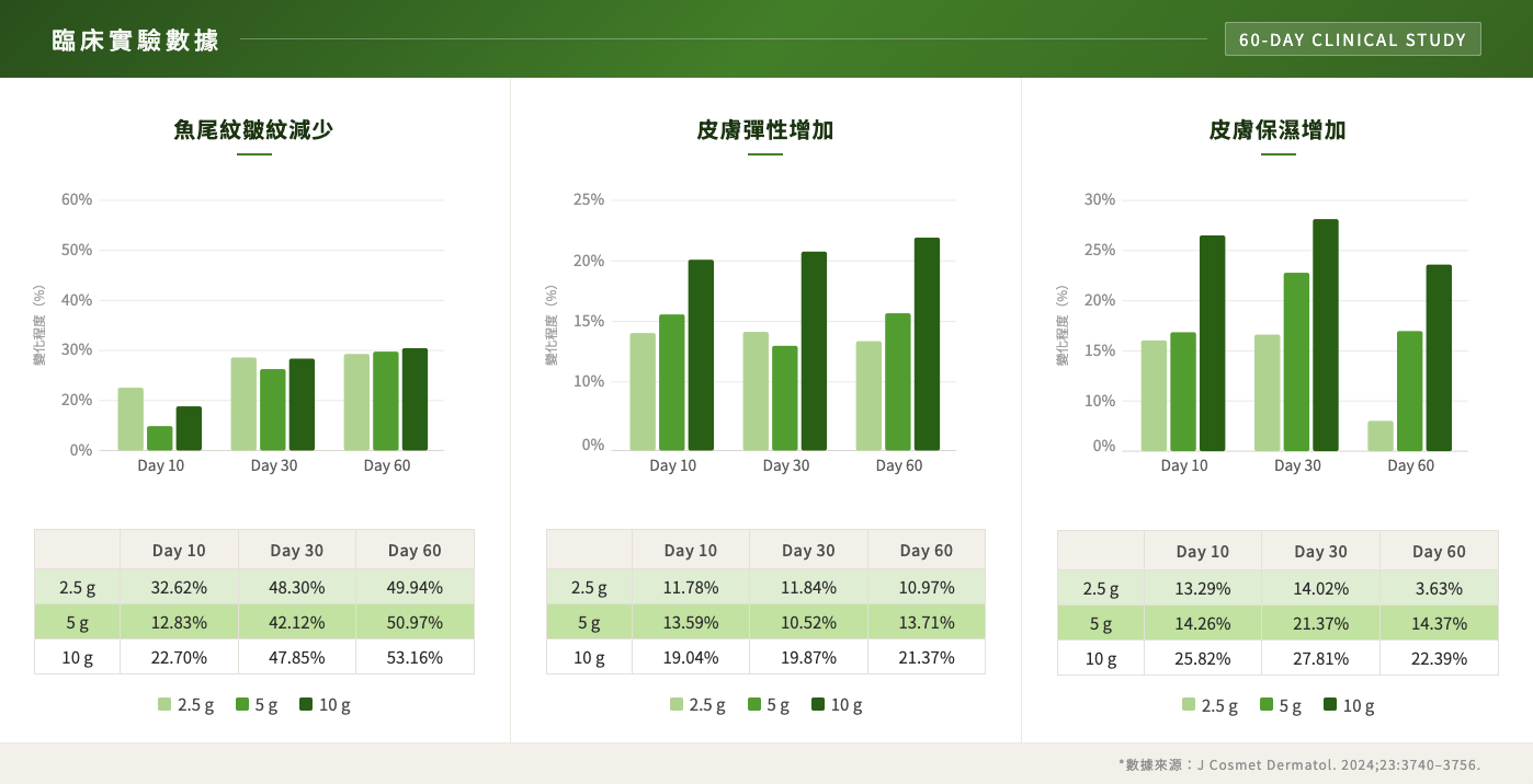 這篇研究最有價值的地方,是有做出VEGCOL® 不同劑量的比較,不是越多越好,而是「達到有效區間」最重要!這正是為什麼「每日5g」會成為一個關鍵設計。