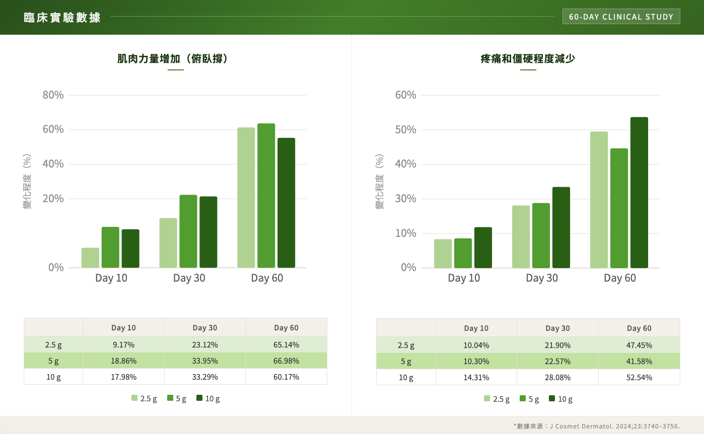👉 綜合結果:肌力表現提升約30–60%,不適感下降約40–50%,代表身體支持能力與活動穩定度提升。