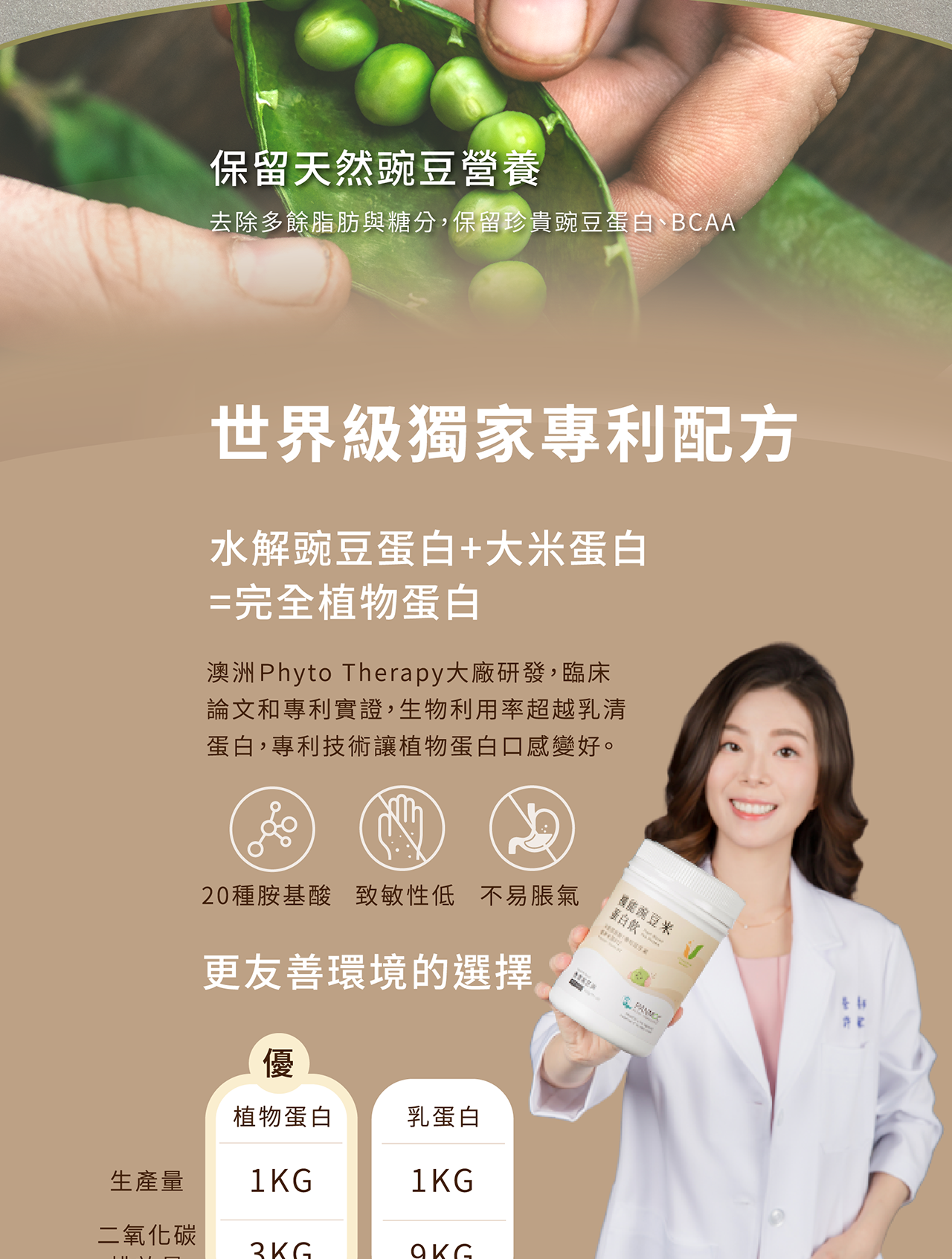 •  友善環境,碳排放較乳清蛋白減少3倍