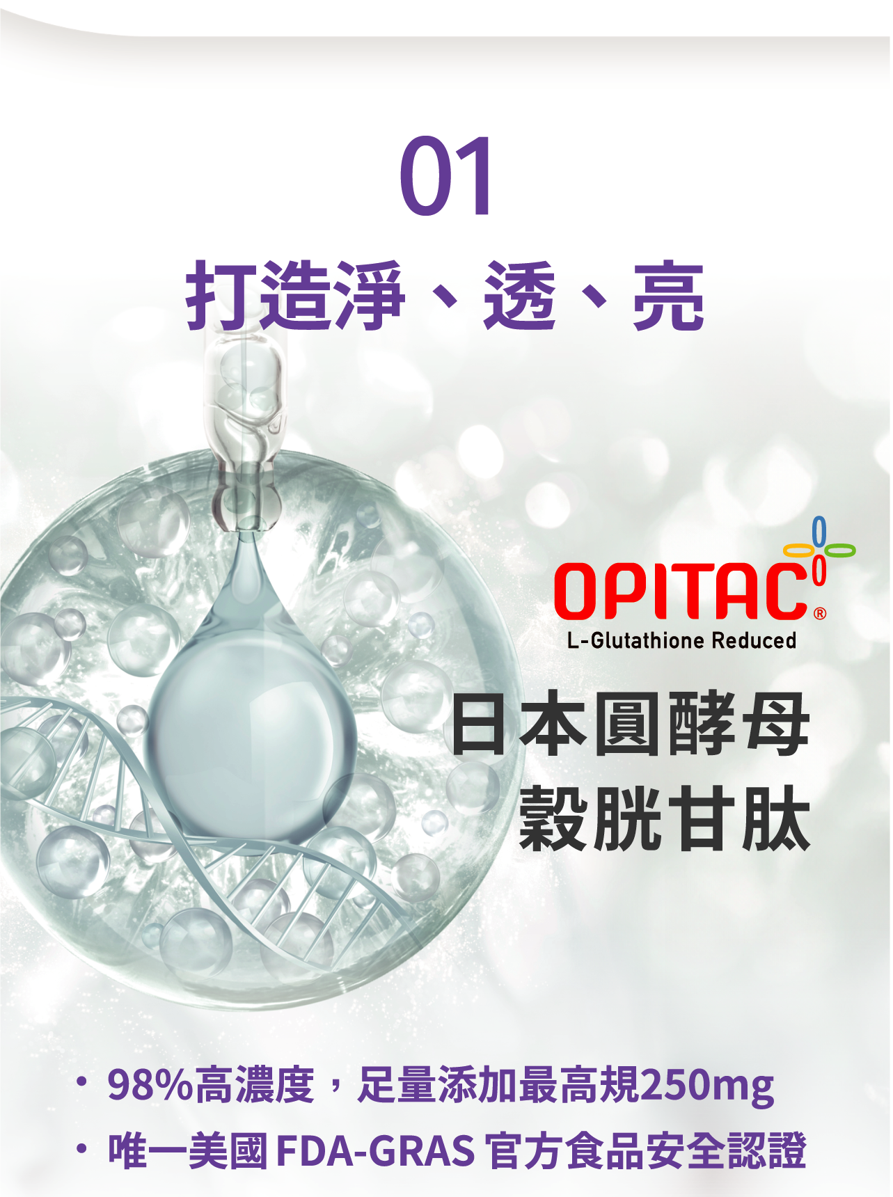 • 亮妍最高規:日本OPITAC®98%穀胱甘肽250mg