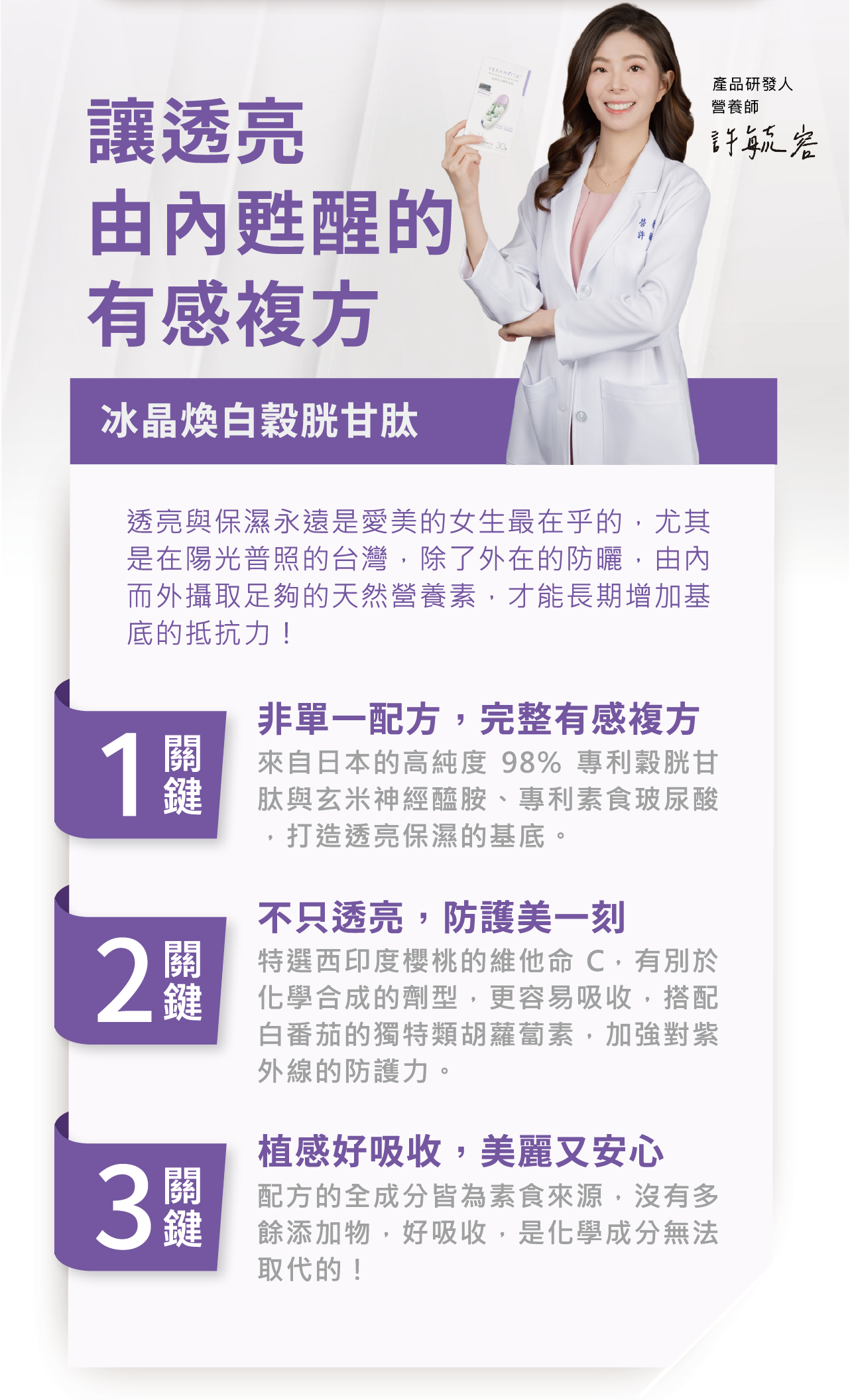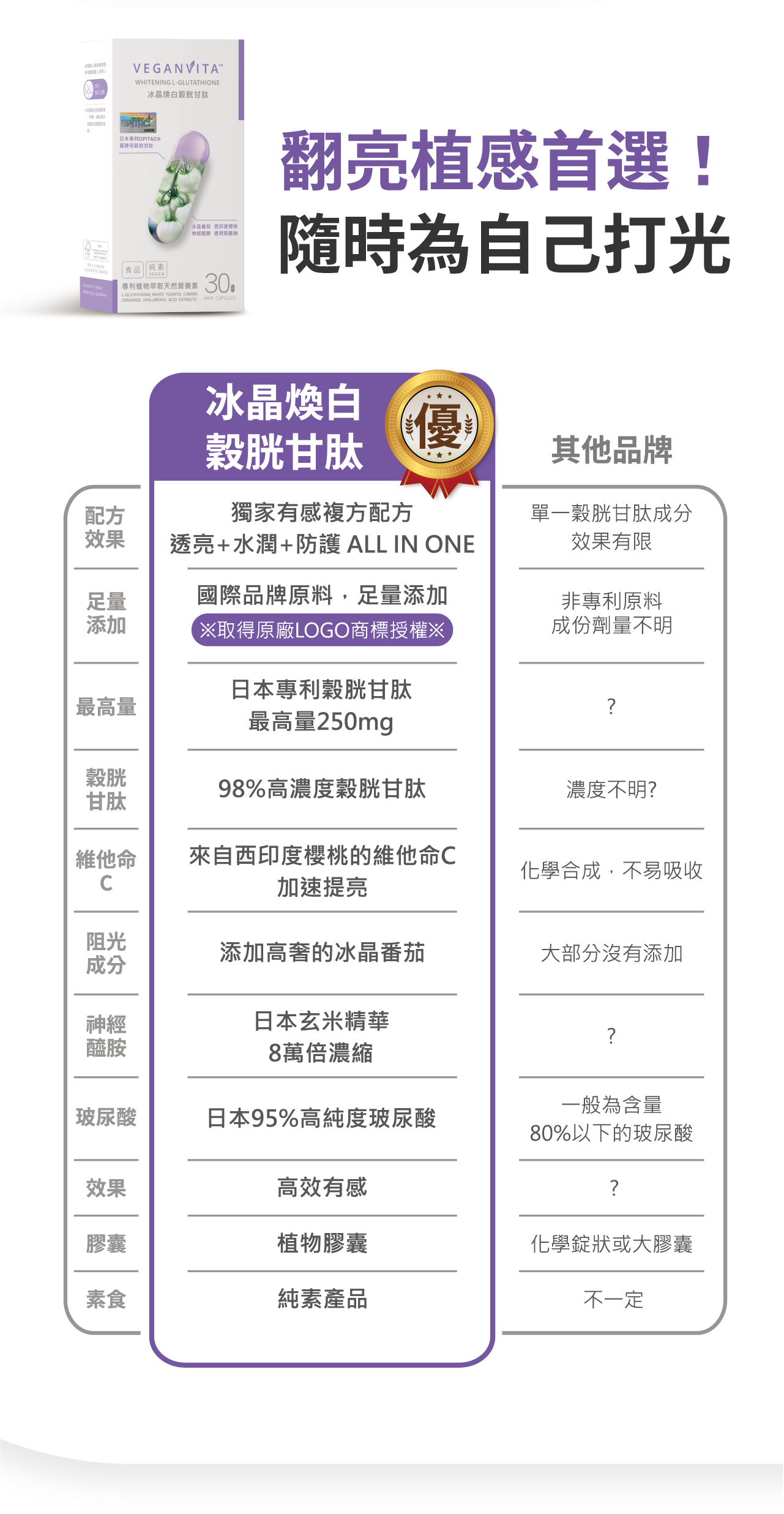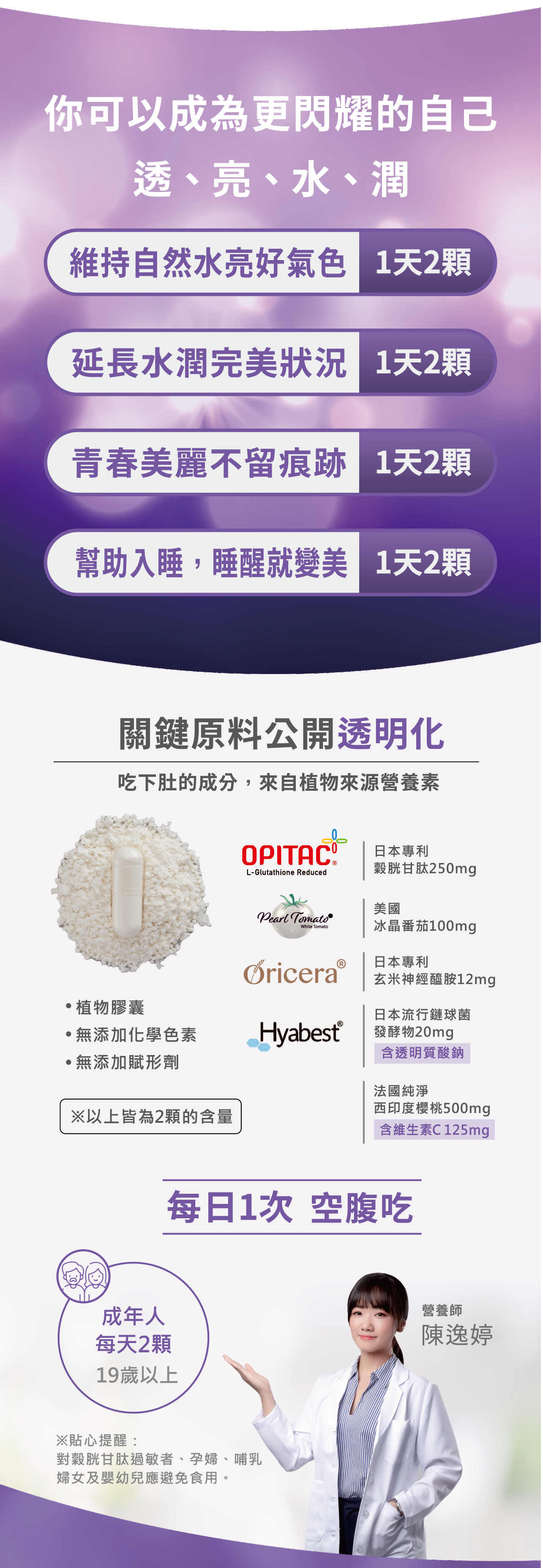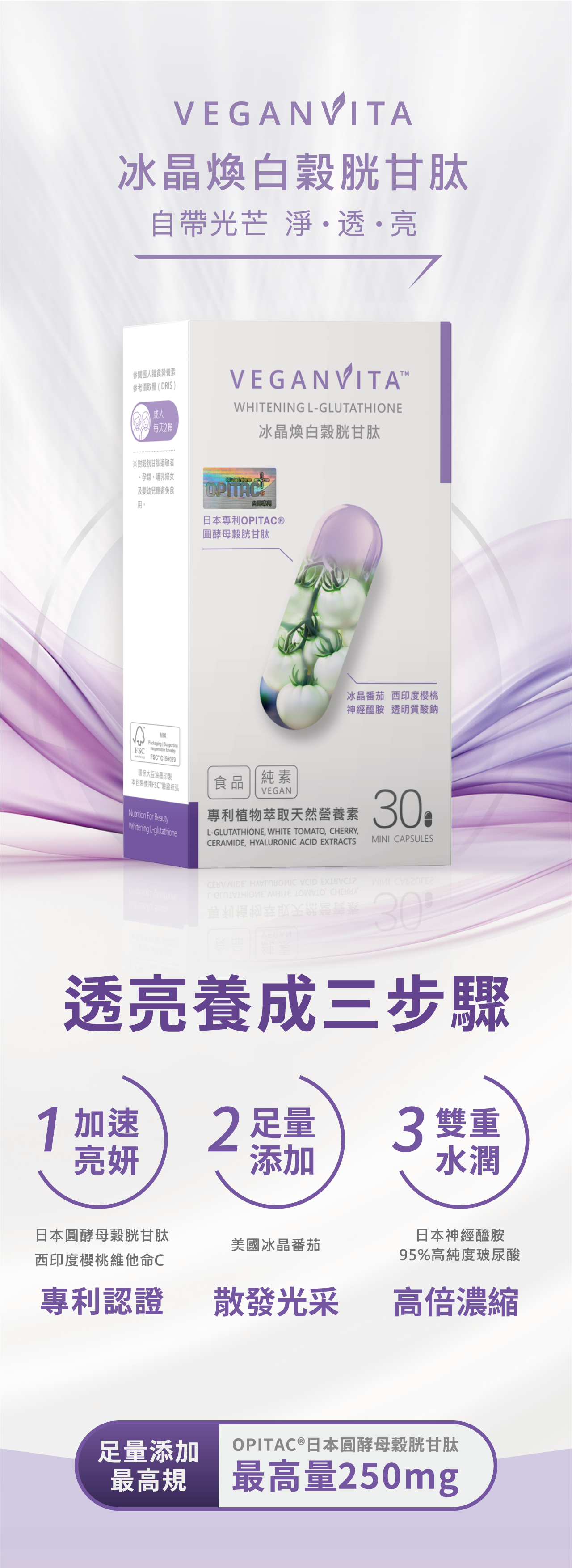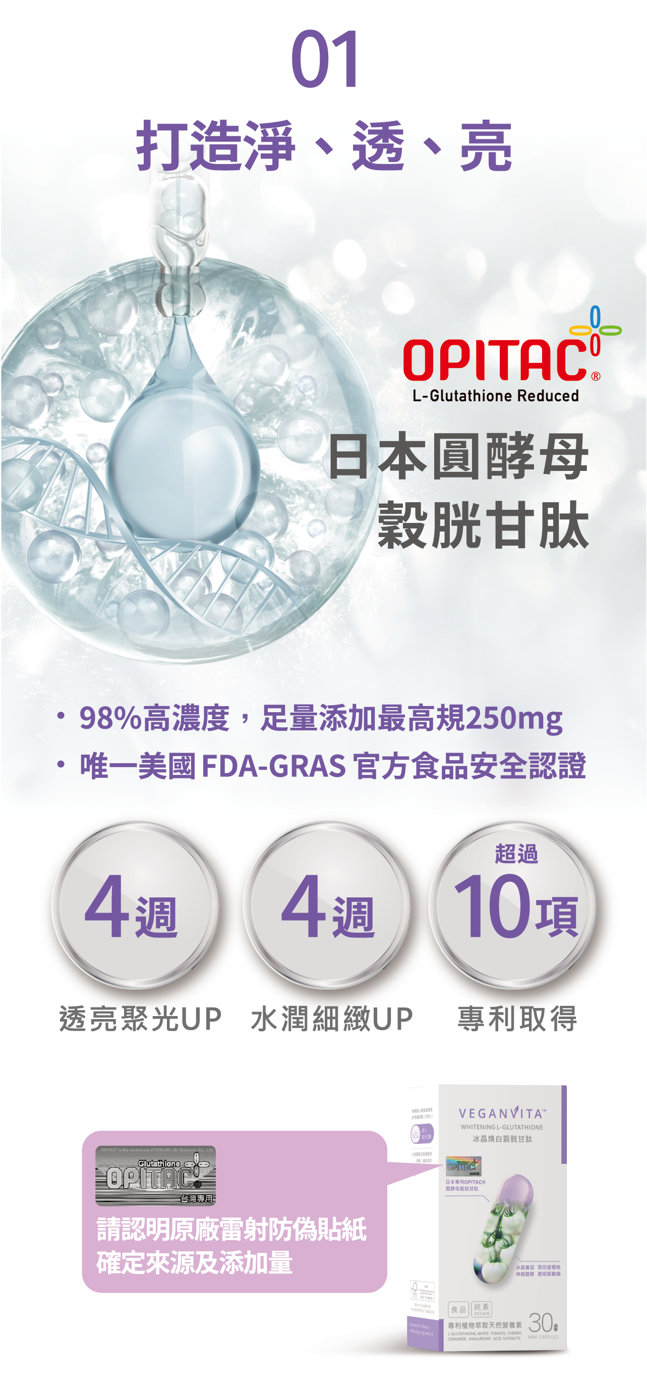 • 亮妍最高規:日本OPITAC®98%穀胱甘肽250mg