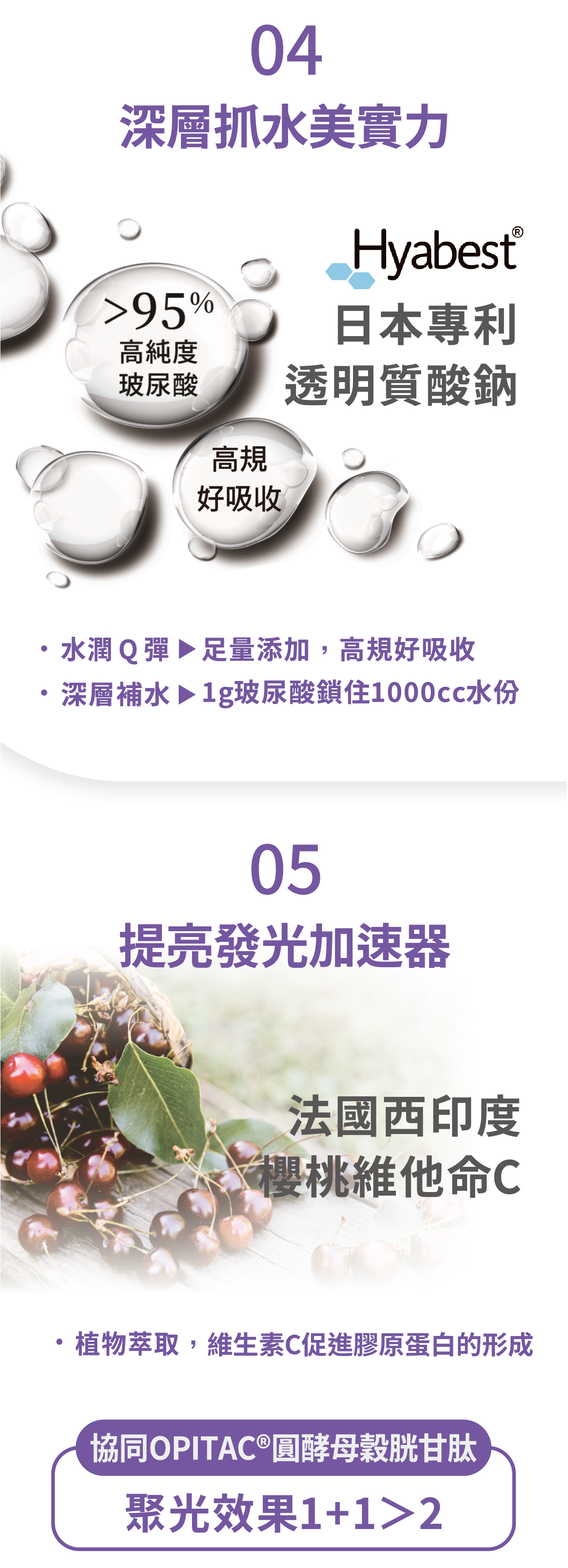 「超能植感Q潤胺基酸」含天然植物萃取的胺基酸,搭配「冰晶煥白穀胱甘肽」裡面的日本OPITAC®98%專利穀胱甘肽250mg、美國冰晶番茄、日本Oricera®專利神經醯胺、日本95%高純度玻尿酸、法國西印度櫻桃維他命C,兩者一起食用,從底層開始全方位補給關鍵營養素,美麗更有感。